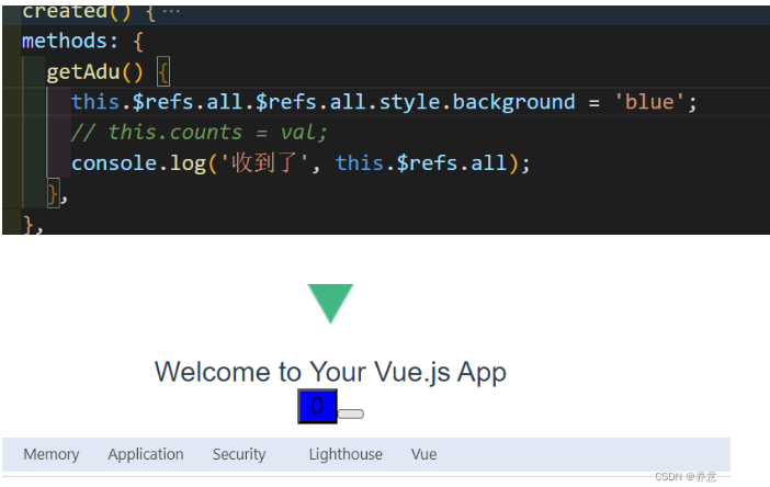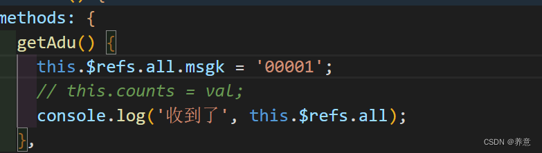 在父组件通过 refs 可以操作到子组件的方法属性值,在父组件中查阅子组件的 refs 属性