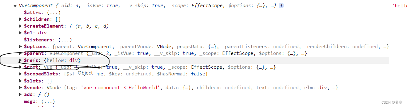 在子组件 div 上添加 ref=hellow, 在父组件的实例上查看子组件的 ref