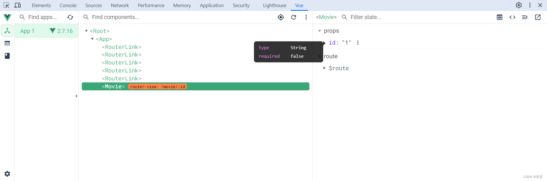 在 vue 控制台可以查看到 movie 组件上的 props 属性已经接收到了值